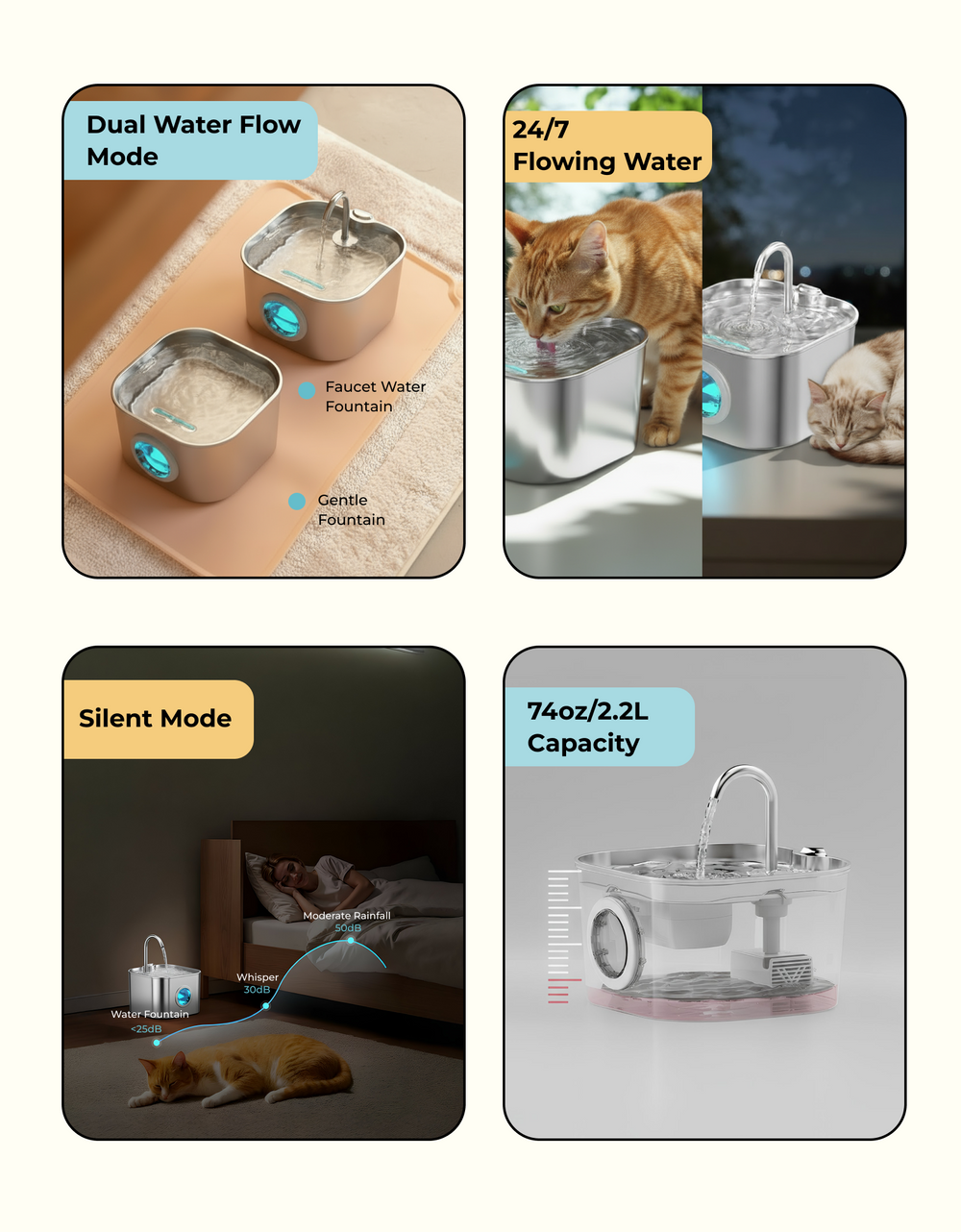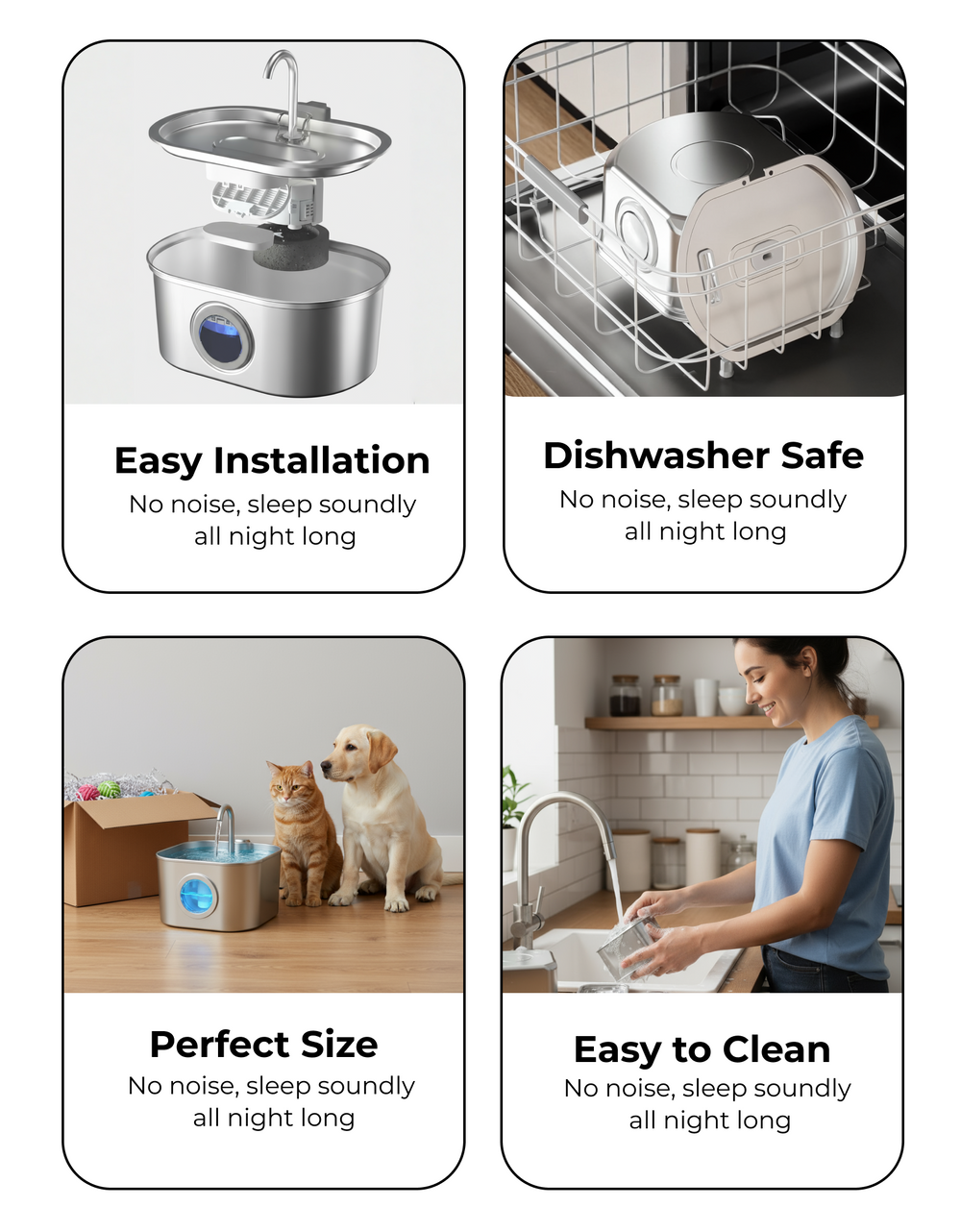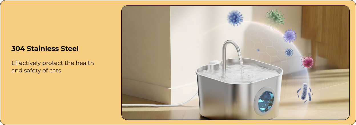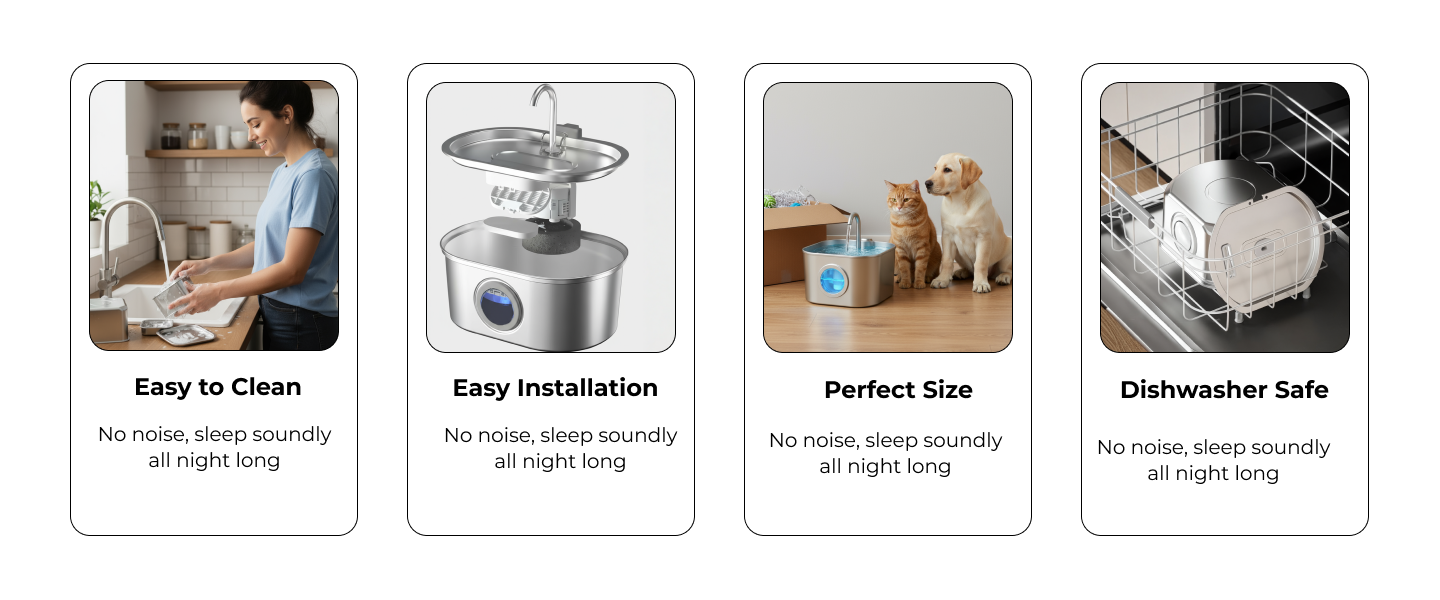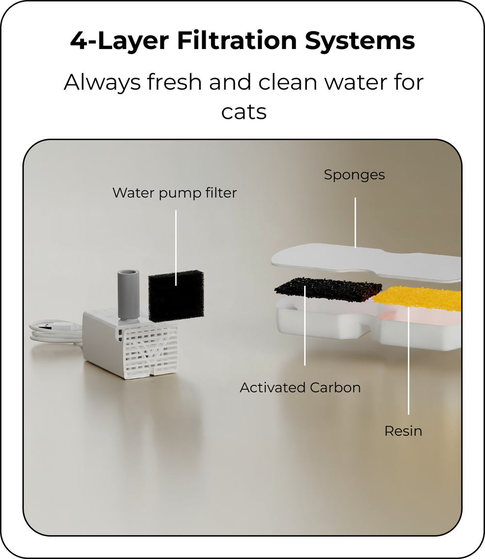 Our fountain is engineered for ultra-quiet operation (<25dB) ensuring it won't disturb you or your pet. If you ever hear the pump, it's a simple fix: the water level is likely too low or the pump needs a quick clean. Regular cleaning every 3-4 weeks ensures it remains whisper-quiet.