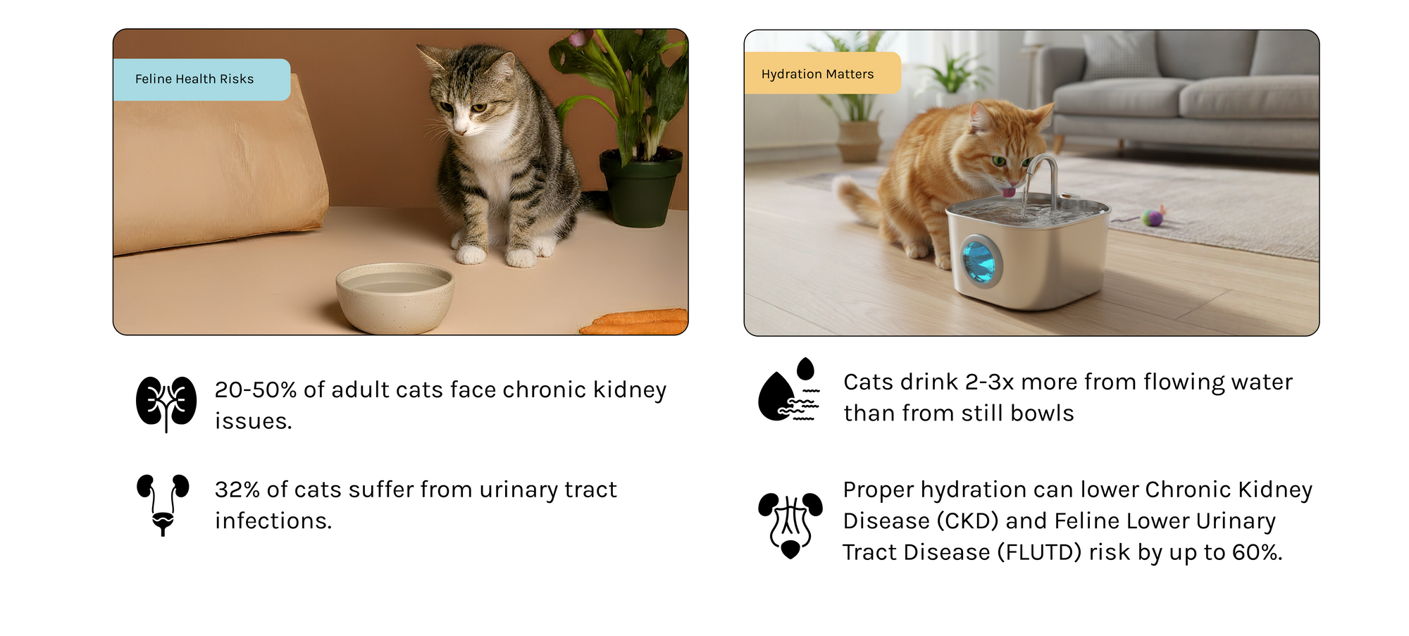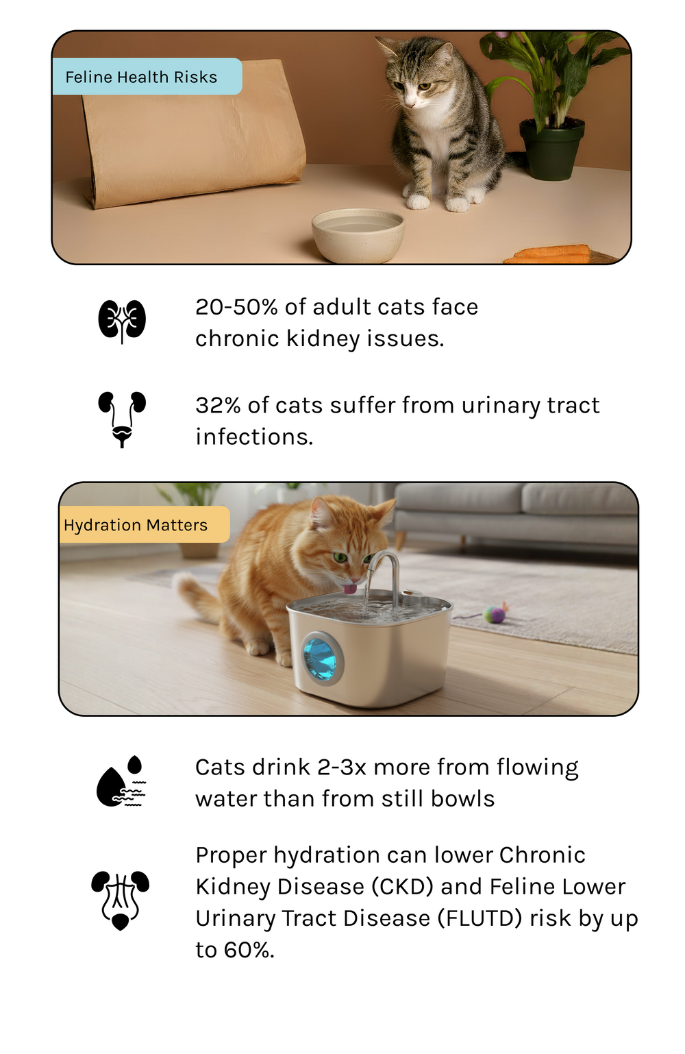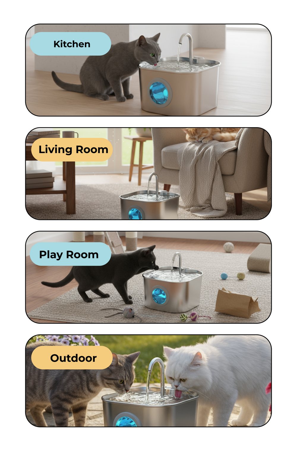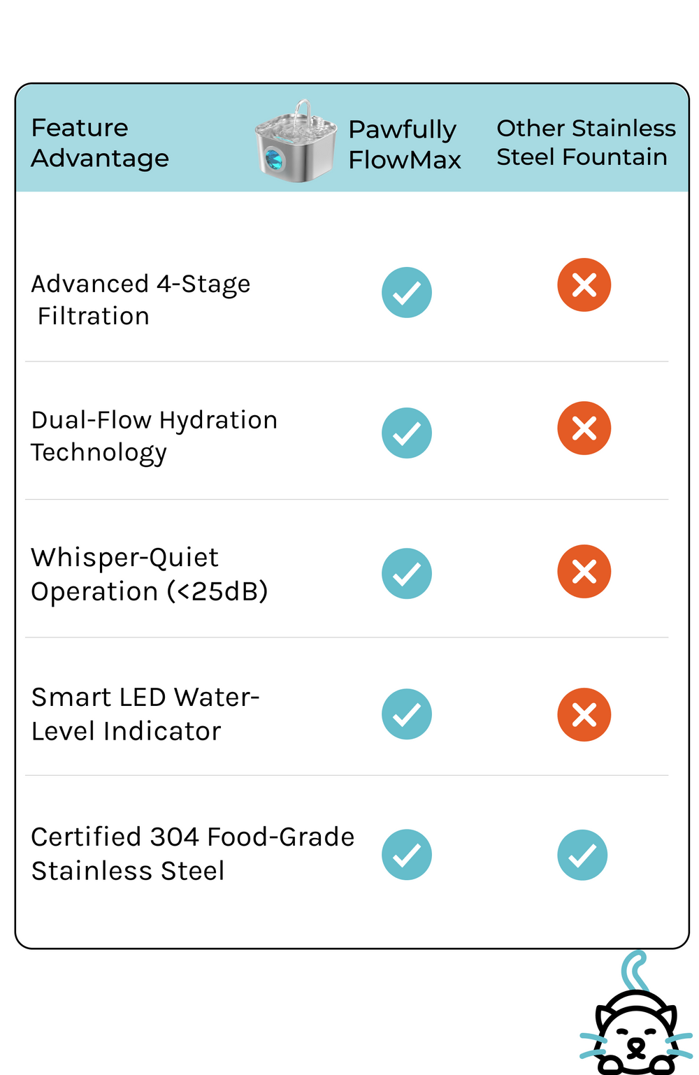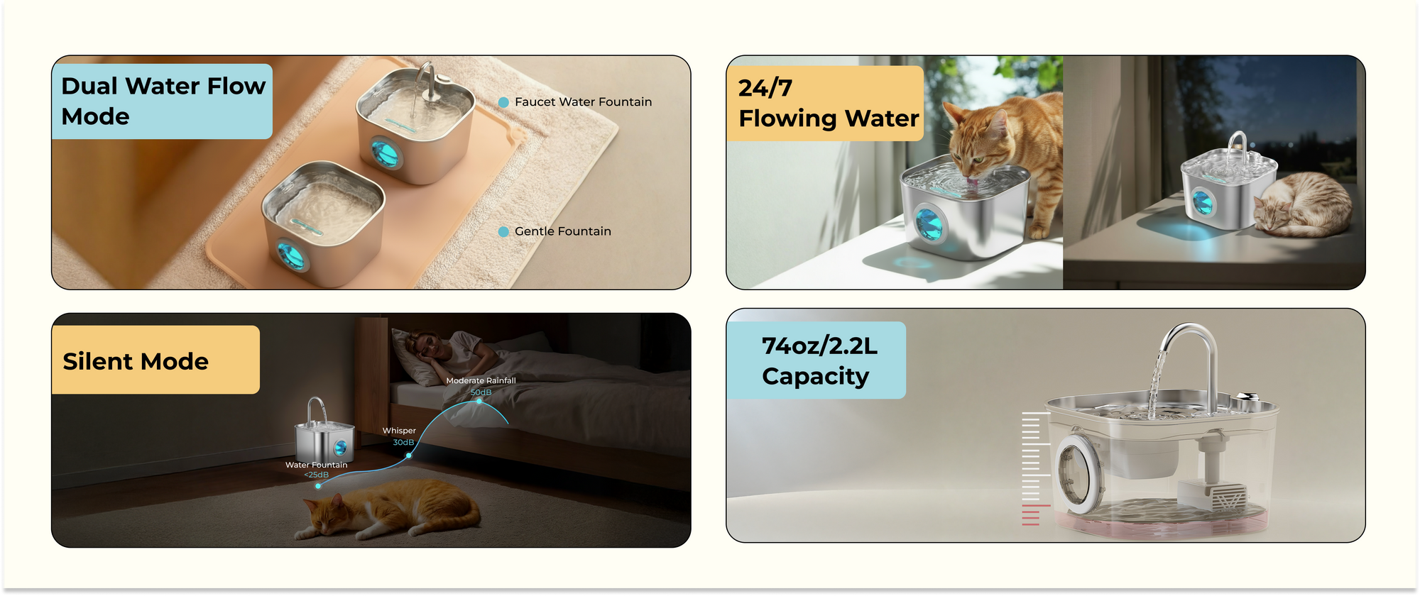 Our fountain is engineered for ultra-quiet operation (<25dB) ensuring it won't disturb you or your pet. If you ever hear the pump, it's a simple fix: the water level is likely too low or the pump needs a quick clean. Regular cleaning every 3-4 weeks ensures it remains whisper-quiet.