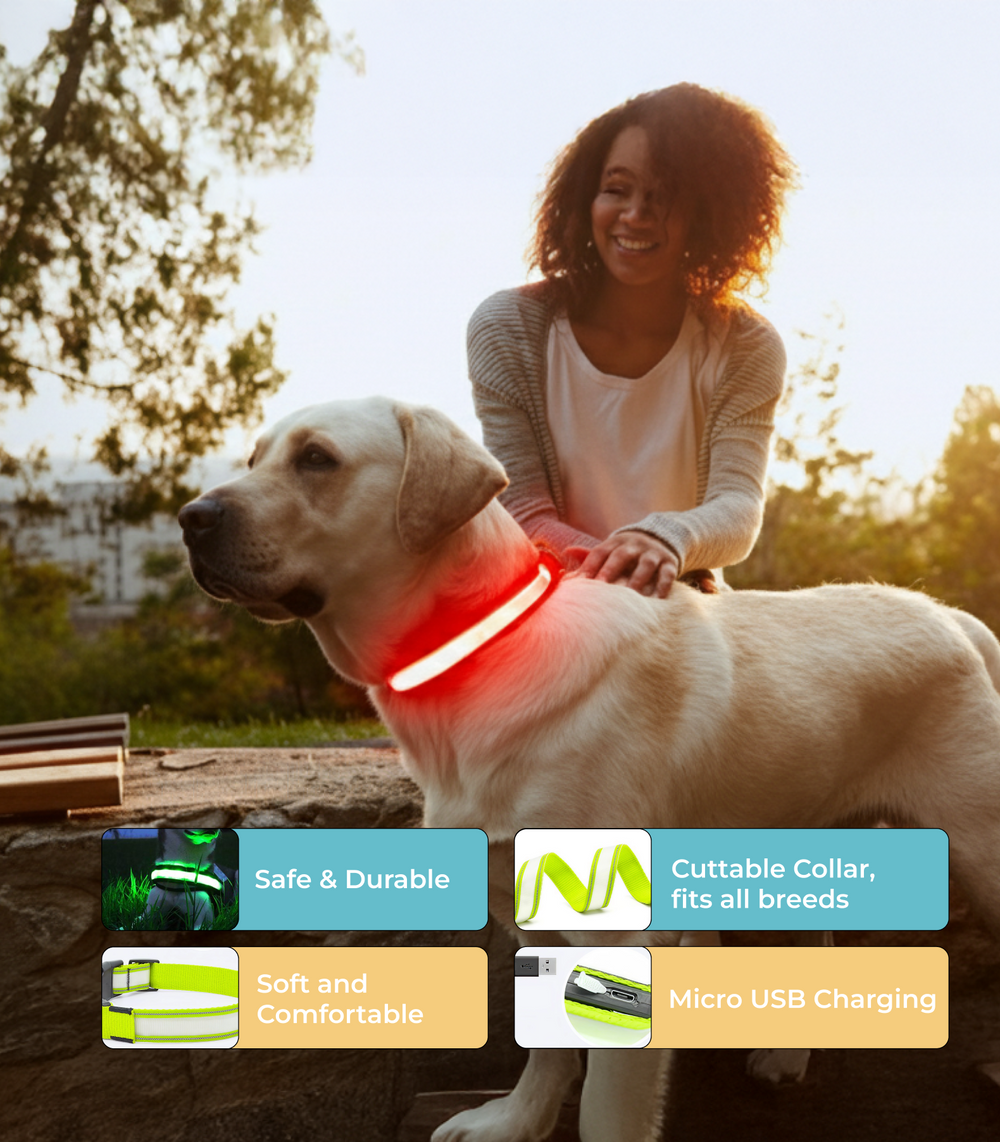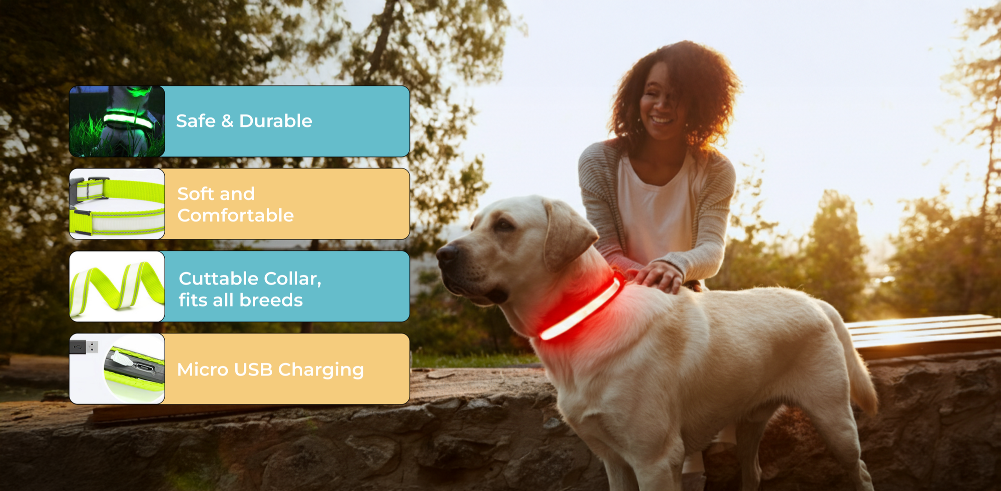 Your dog's safety is our top priority. In low-light conditions, this collar makes your dog highly visible to motorists, cyclists, and pedestrians from a distance. It’s an essential safety tool that provides peace of mind, ensuring your best friend is seen and safe during night-time adventures.